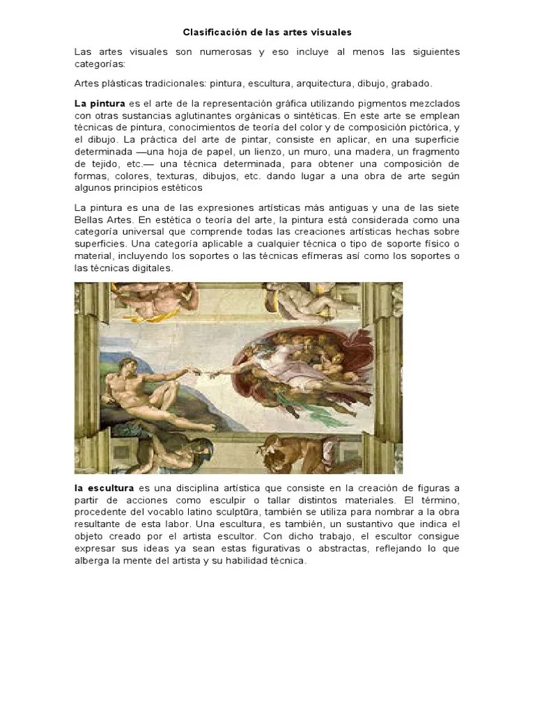 Lee las letras de colores 2... Una clasificación tradicional es la siguiente: Cuando se habla de historia del arte o de las artes plásticas, regularmente se elimina a las artes auditivas y a las artes escénicas; Clasificación de las artes visuales 1. Incluyendo a las artes plásticas, son todas aquellas que para su consumo, se utiliza la vista. Las artes plásticas son una forma de expresión o … Mientras que las artes visuales abarcan un espectro mayor de manifestaciones; Interactúa con el arte participa en procesos creativos con los lenguajes del arte —música, artes visuales y dramáticas, danza y otros— …. Cuando se habla de historia del arte o de las artes plásticas, regularmente se elimina a las artes auditivas y a las artes escénicas;